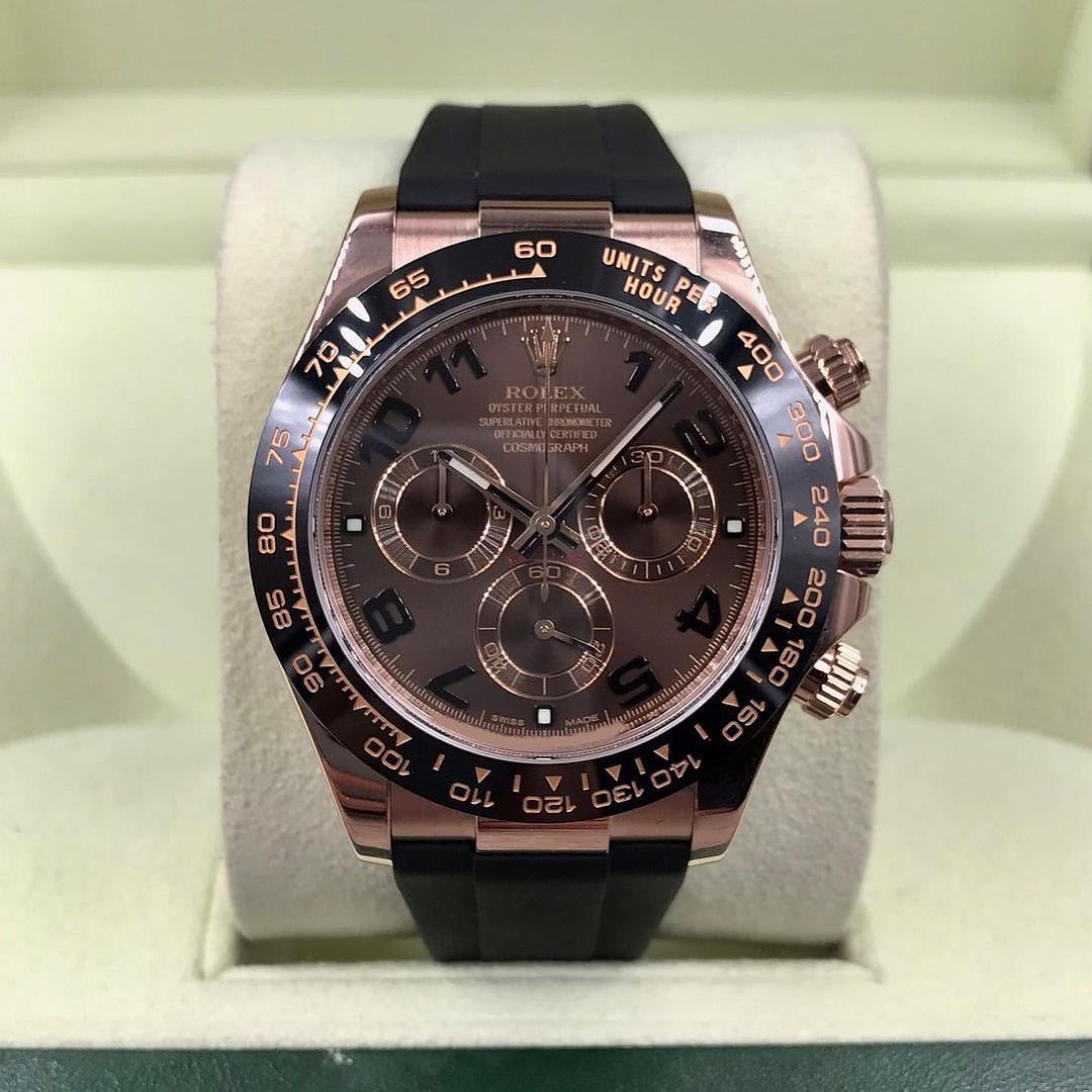 Il Rolex Cosmograph Daytona Everose Oysterflex con quadrante chocolate e numeri arabi è una delle configurazioni più moderne e aggressive dell’iconico Daytona. La combinazione tra oro Everose, lunetta nera Cerachrom e cinturino Oysterflex crea un contrasto perfetto tra lusso e sportività.